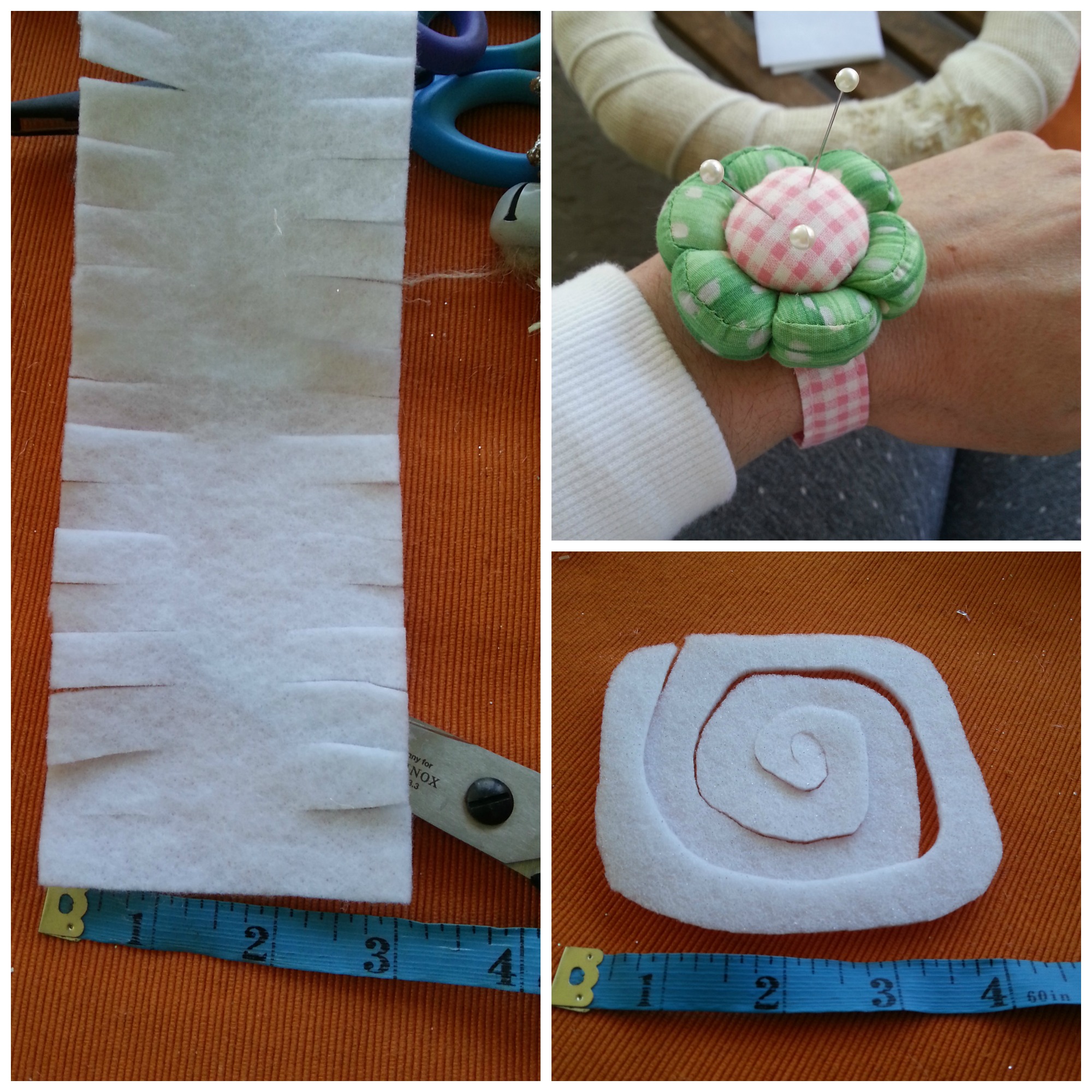 I made 8-10 flowers in each color using 2 sheets of felt (6 sheets of felt total). I used pearl topped pins for each flower; pushing it through the center and the end of the felt that tucks up onto the bottom of each rose instead of sewing each flower. For the other flowers I pushed a pin through the side and another pin through the center. Obviously be careful you don’t prick yourself.