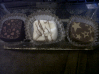 This isn’t a good picture. We had a nice box of 3 chocolate truffles with a gold bow for our wedding favors.